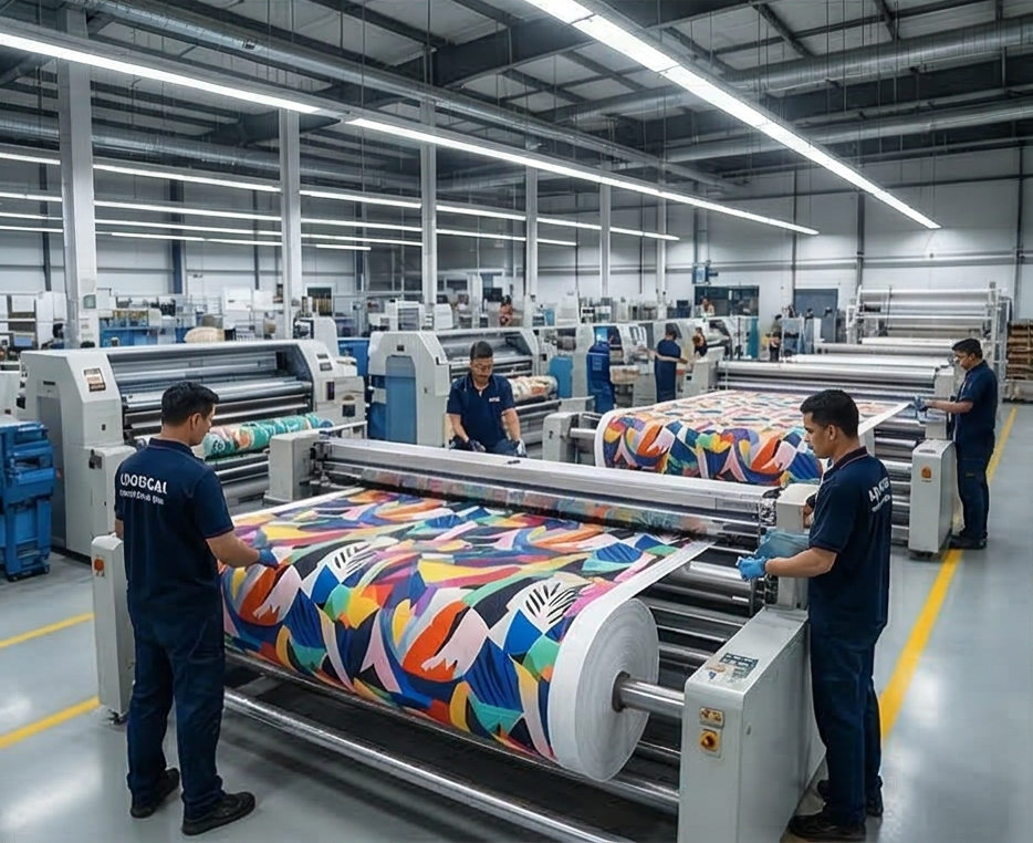Large scale fabric printing and production capabilities supporting garment manufacturers and textile buyers.